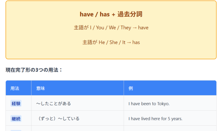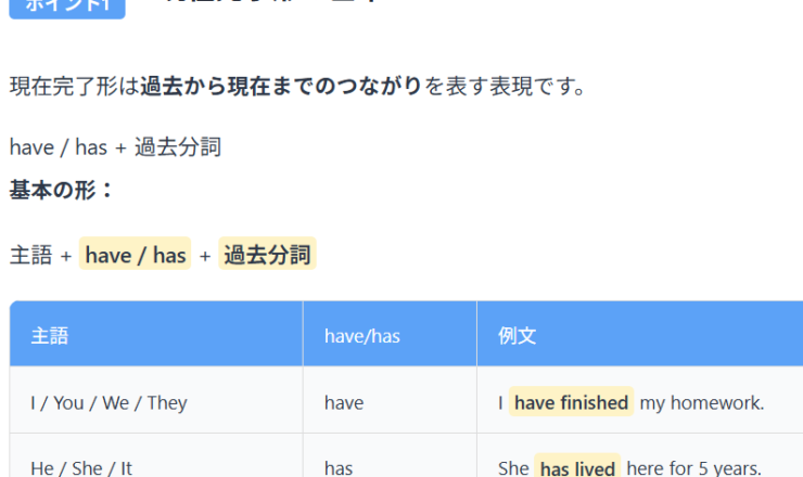 📚 基礎レベル ポイント1 現在完了形とは? 現在完了形は、過去の出来事が現在に影響していることを表す文法です。 have / ha...