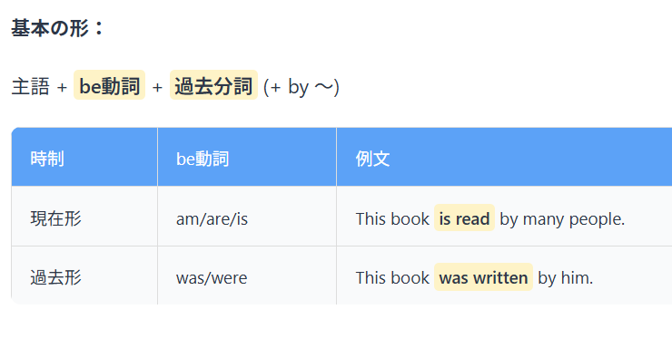 📚 基礎レベル ポイント1 受動態の基本 受動態は「〜される」「〜された」という動作を受ける側を主語にした表現です。 be動詞 + ...