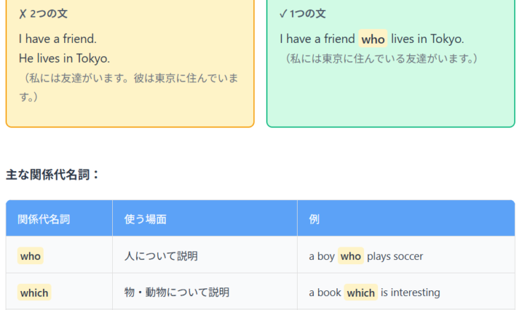 📚 基礎レベル ポイント1 関係代名詞とは 関係代名詞は、2つの文を1つにつなぐ働きをします。名詞を詳しく説明するときに使います。 ...