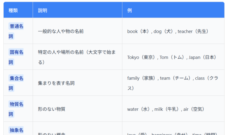 📚 基礎レベル ポイント1 名詞とは? 名詞は、人・物・場所・概念などの名前を表す言葉です。 種類 説明 例 普通名詞 一般的な人や...