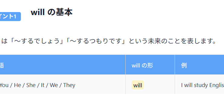 📚 基礎レベル ポイント1 will の基本 will は「〜するでしょう」「〜するつもりです」という未来のことを表します。 主語 ...