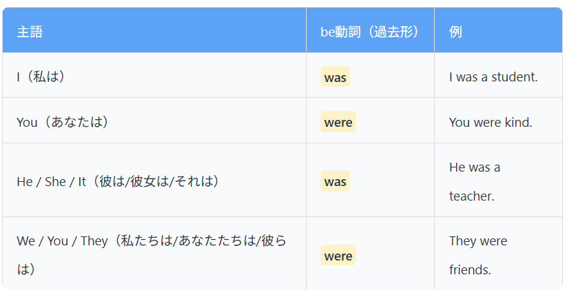 be動詞の過去形は「〜でした」「〜にいました」という意味を表します。主語によって形が変わります。