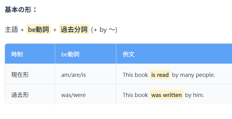 主語 + be動詞 + 過去分詞 (+ by 〜)