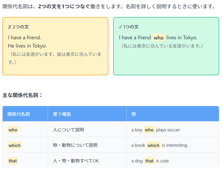 関係代名詞は、2つの文を1つにつなぐ働きをします。名詞を詳しく説明するときに使います。