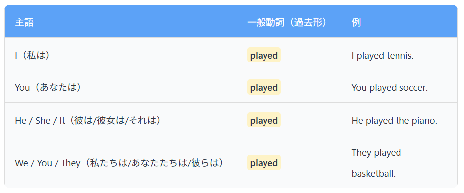 一般動詞の過去形は「〜した」という過去の動作を表します。主語によって形は変わりません。