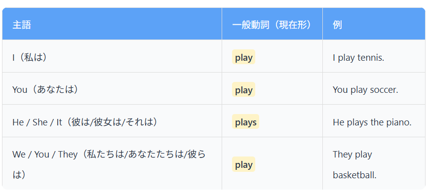 He / She / It(彼は/彼女は/それは) | plays | He plays the piano. |